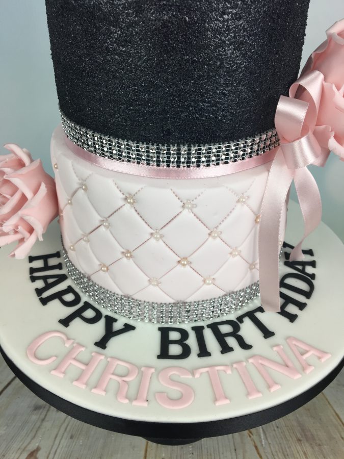 The top tier is coated in sparkly black sugar with a diamante topper. The bottom tier has a quilting effect & sugar pearls. Both tiers have a diamante trim and feature handmade sugar flowers.